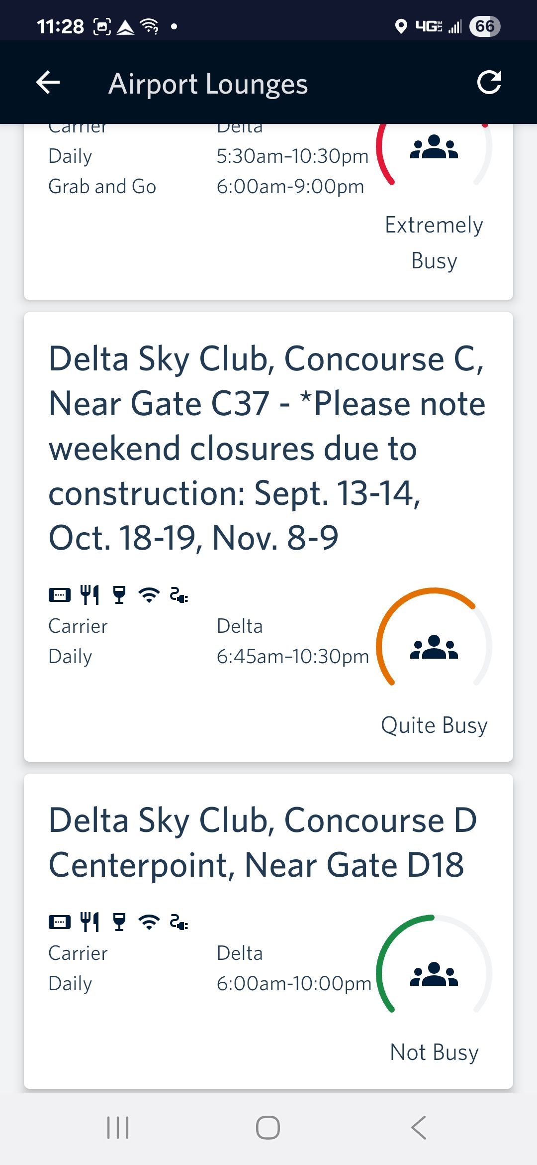 The Fly Delta app is easy to use for assessing Sky Club capacity. When you arrive in Atlanta, go to the Delta Sky Club tab (it has a cocktail glass icon) and open. It will open to a list of the Atlanta Sky Clubs and describe their status ranging from “extremely busy” to “not busy.” Even if you can get into an “extremely” busy Club, bear in might that you might be the last person who brings the Club to full capacity. We have found that a short walk to the next concourse is well worth it as a less busy club offers a better choice of seating and a more relaxed atmosphere (and less likelihood of lines at the buffet, bar, coffee machine, etc.).